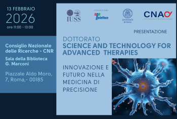 Il 13 Febbraio 2026, presso la sede centrale del Consiglio Nazionale delle Ricerche (CNR), nella Sala della Biblioteca G. Marconi, si terrà l’evento di presentazione del Dottorato Nazionale in Science and Technology for Advanced Therapies (STAT), sviluppato, promosso e coordinato dalla Scuola Universitaria Superiore IUSS di Pavia in collaborazione con Fondazione Telethon, Università di Pavia e Fondazione CNAO.